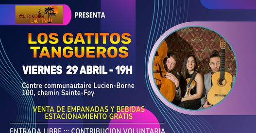 Le vendredi 29 avril à 19h, les Gatitos Tangueros iront se dérouiller les pattes et la voix au « Rincón Latino », à la salle 203 du centre Lucien-Borne. Au plaisir de vous y voir !